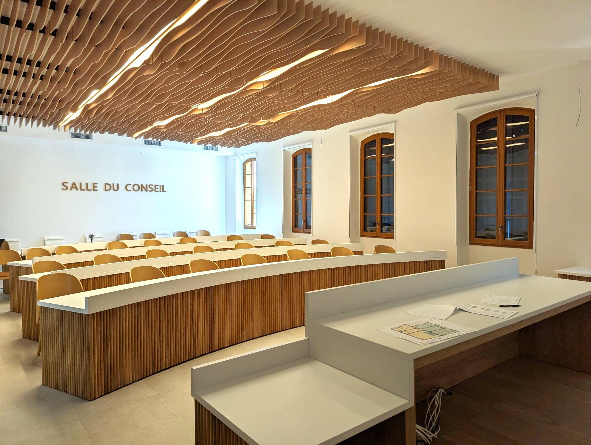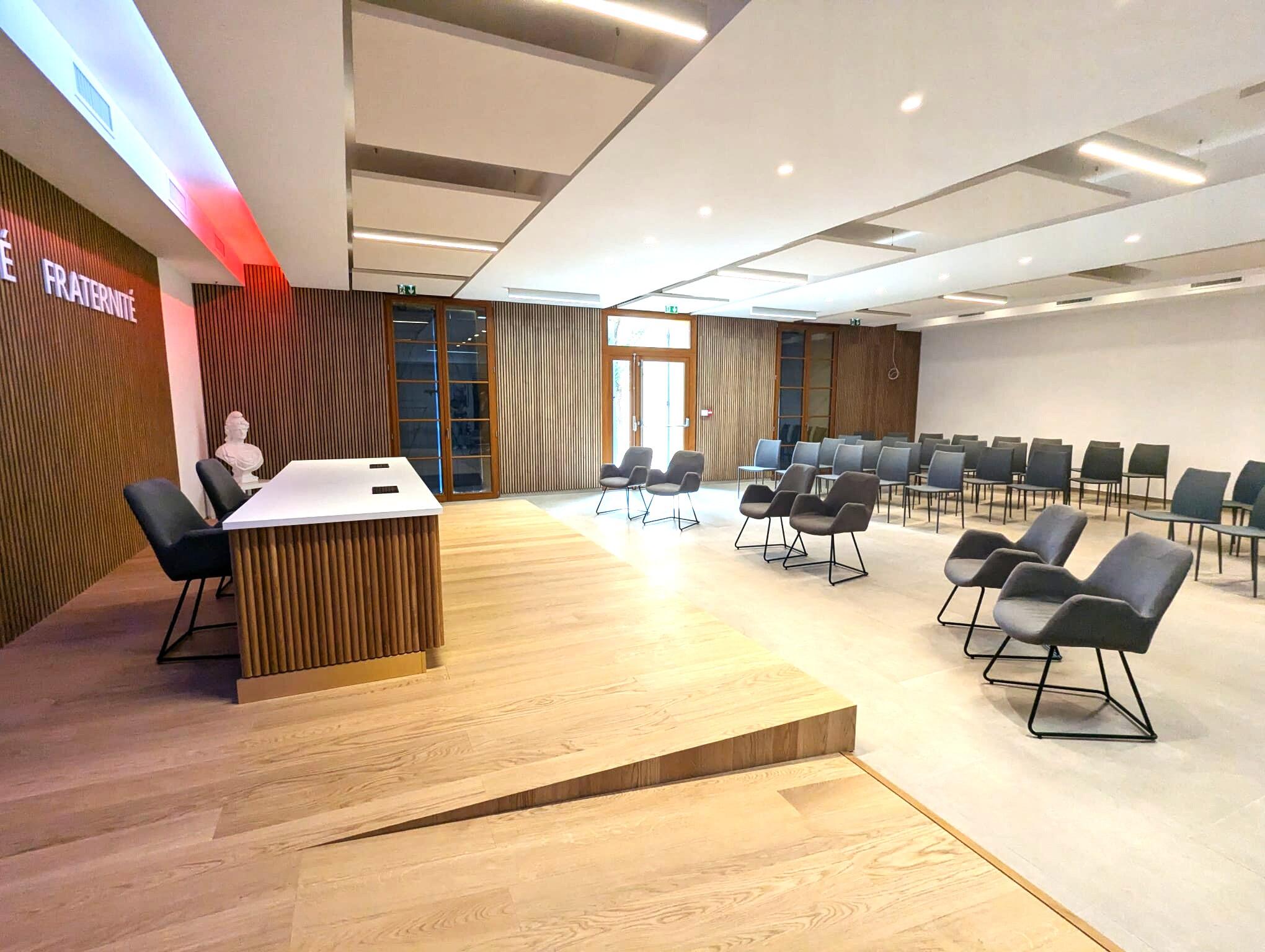 Le projet comprend la salle des mariages, la salle du conseil municipal et les espaces d’accueil, repensés dans un esprit contemporain et élégant.